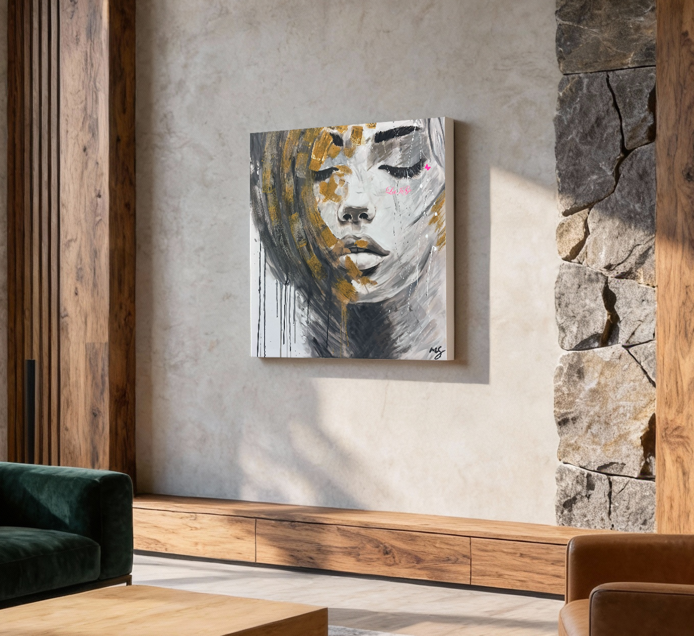 Das Gemälde zeigt ein expressives Porträt einer Frau mit geschlossenen Augen in Grautönen, akzentuiert durch goldene Pinselstriche. Der pinke Schriftzug „Let It Go“ und ein kleiner Schmetterling setzen einen lebendigen Kontrast und unterstreichen die Botschaft des Loslassens. Fließende Linien und Tropfen verleihen dem Werk eine moderne, melancholisch-poetische Tiefe.