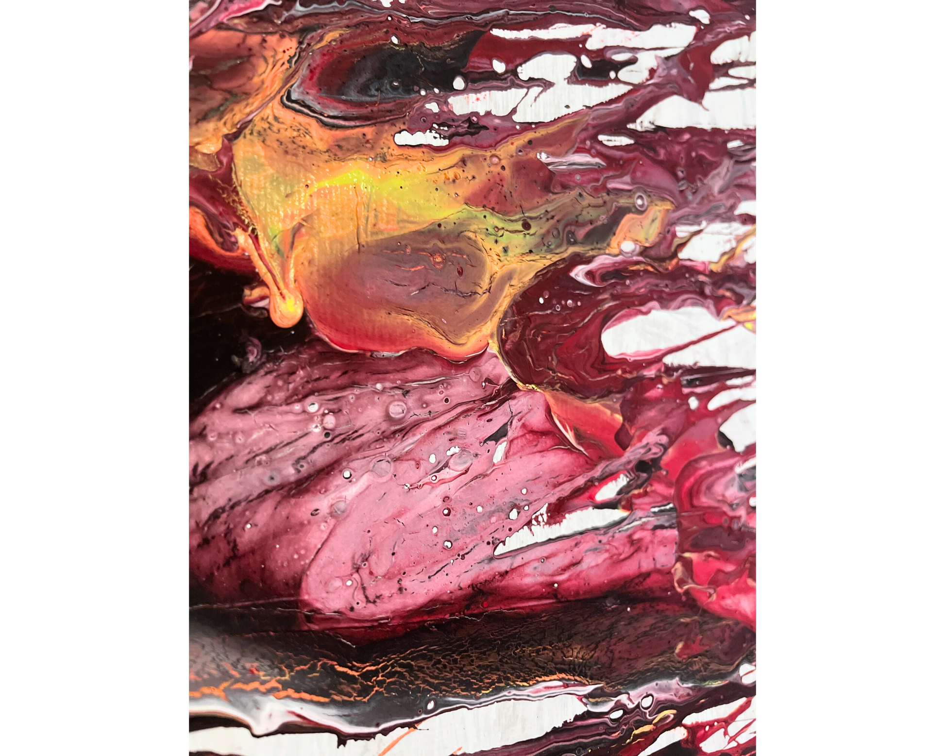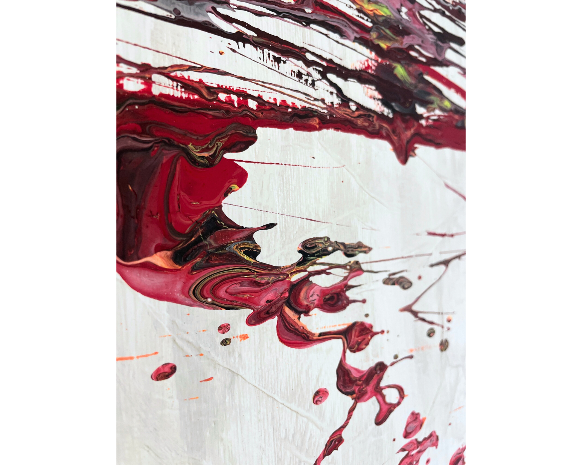 Das Bild vereint kraftvolle, fließende Farbbewegungen in Rot und Schwarz mit einem ruhigen, hellen Hintergrund. Inmitten der Dynamik lädt es dazu ein, einen Moment innezuhalten und die eigene Energie bewusst wahrzunehmen. Stärke und Achtsamkeit begegnen sich in einem ausgewogenen Spannungsfeld.
